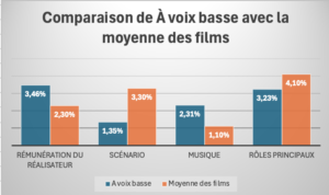 Comme on le voit, par rapport à la moyenne des films, « À voix basse » consacre un pourcentage du budget général bien supérieur à la rémunération de la réalisatrice et au budget de la musique. En revanche, il consacre un pourcentage bien inférieur au budget du scénario et à la rémunération des rôles principaux.