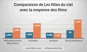 Pour bien illustrer la part du budget que la production de « Le filles du ciel » a consacré aux quatre principaux postes de l’affiche par rapport à ce qui leur est consacré dans la moyenne des films le tableau ci-dessous est éclairant :