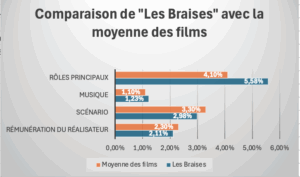 Pour bien illustrer la part du budget que la production de «Les Braises » a consacré aux quatre principaux postes de l’affiche par rapport à ce qui leur est consacré dans la moyenne des films le tableau ci-dessous est éclairant:
