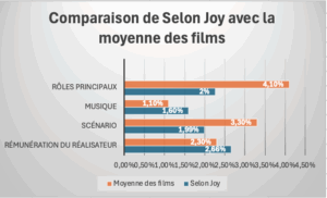 Pour bien illustrer la part du budget que la production de «Selon Joy » a consacré aux quatre principaux postes de l’affiche par rapport à ce qui leur est consacré dans la moyenne des films le tableau ci-dessous est éclairant :