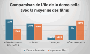 Pour bien illustrer la part du budget que la production de « L’île de la demoiselle » a consacré aux quatre principaux postes de l’affiche par rapport à ce qui leur est consacré dans la moyenne des films le tableau ci-dessous est éclairant :