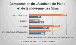 Pour bien illustrer la part du budget que la production de « La petite cuisine de Mehdi » a consacré aux quatre principaux postes de l’affiche par rapport à ce qui leur est consacré dans la moyenne des films le tableau ci-dessous est éclairant :