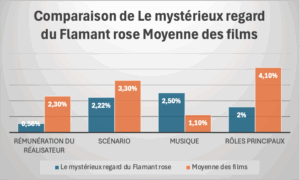Pour bien illustrer la part du budget que la production de « Le mystérieux regard du Flamant rose» a consacré aux quatre principaux postes de l’affiche par rapport à ce qui leur est consacré dans la moyenne des films le tableau ci-dessous est éclairant :