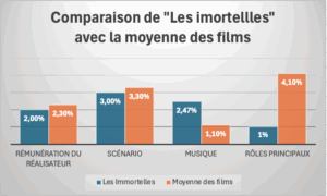 Pour bien illustrer la part du budget que la production de « Les immortelles » a consacré aux quatre principaux postes de l’affiche par rapport à ce qui leur est consacré dans la moyenne des films le tableau ci-dessous est éclairant :