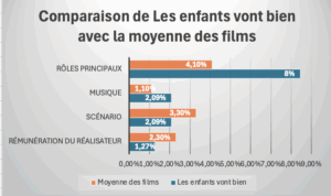 Pour bien illustrer la part du budget que la production de « Les enfants vont bien » a consacré aux quatre principaux postes de l’affiche par rapport à ce qui leur est consacré dans la moyenne des films le tableau ci-dessous est éclairant :