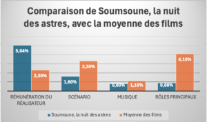 Pour bien illustrer la part du budget que la production de «Soumsoum, la nuit des astres » a consacré aux quatre principaux postes de l’affiche par rapport à ce qui leur est consacré dans la moyenne des films le tableau ci-dessous est éclairant :
