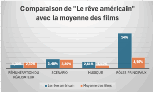 Pour bien illustrer la part du budget que la production de « Le rêve américain » a consacré aux quatre principaux postes de l’affiche par rapport à ce qui leur est consacré dans la moyenne des films le tableau ci-dessous est éclairant :