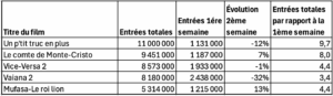 La fréquentation totale de 4 d’entre eux se situe entre 4,4 et 9,7 fois la fréquentation de la première semaine. Et ces performances pouvaient se prévoir dès la seconde semaine puisque l’évolution par rapport â la semaine précédente se situait entre +13% et -12%, donc, bien mieux que les -30%. Seule la carrière de « Vaiana 2 » n’a pas évolué de manière exceptionnelle. Mais le film avait démarré à 2,438 millions d’entrées, un niveau record.