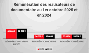 En ce qui concerne le baromètre de la rémunération des réalisateurs des documentaires, là aussi les chiffres sont presque similaires. En 2024 la rémunération la plus élevé d’un réalisateur était 82 000 €. C’était celle de Anna Recalda Miranda pour « De la guerre froide à la guerre verte » dont le budget prévisionnel était 657 000 € et qui n’avait rassemblé que 250 spectateurs. Au 1er octobre 2025, elle est de 80 000 €, un film au budget prévisionnel de 970 000 € et qui vient de sortir.